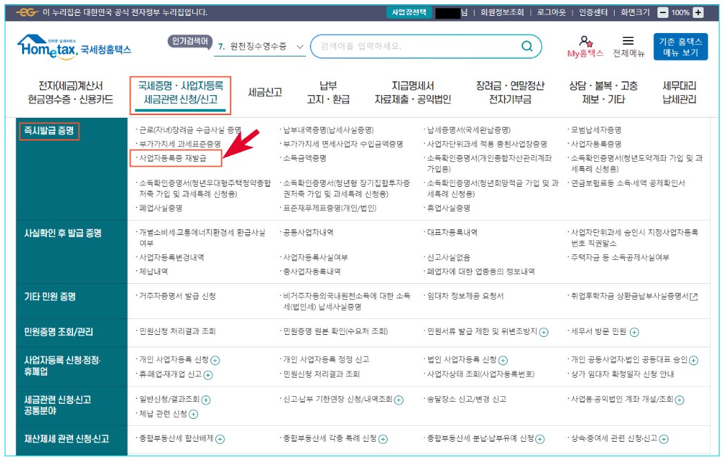 3) 로그인 완료 후, 국세증명-사업자등록 세금관련 신청/신고 목록 중 즉시발급 증명-사업자등록증 재발급을 클릭합니다.